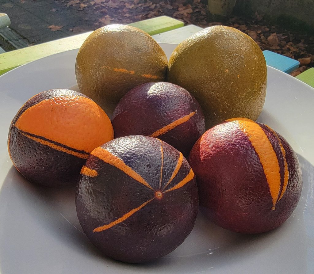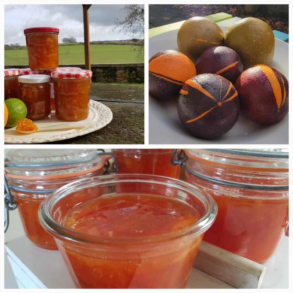 This year I saw a recipe for Bergamot jelly which I decided to try – delicious. However I was left with lots of cooked bergamot after straining the juice, so I changed the clementine cake into a bergamot cake, with success I am glad to say. Tried and tested by others, not just family. Our supermarket also finally stocked Chocolate Navel Oranges, which I think I have mentioned before. Until now I have had to go to Toulouse to find them. Not this year. They are olive skinned oranges with the sweetest flavour, great to eat, turn into an orange salad and of course make marmalade! You have to be quick though as the season is pretty short. Now it is the turn of blood oranges, another favourite. I think marmalade making is one of my feel-good activities – maybe it’s the smell or the satisfaction of a row of jars brimming with one of my favourite things or perhaps the fact that you can’t hurry the process.
